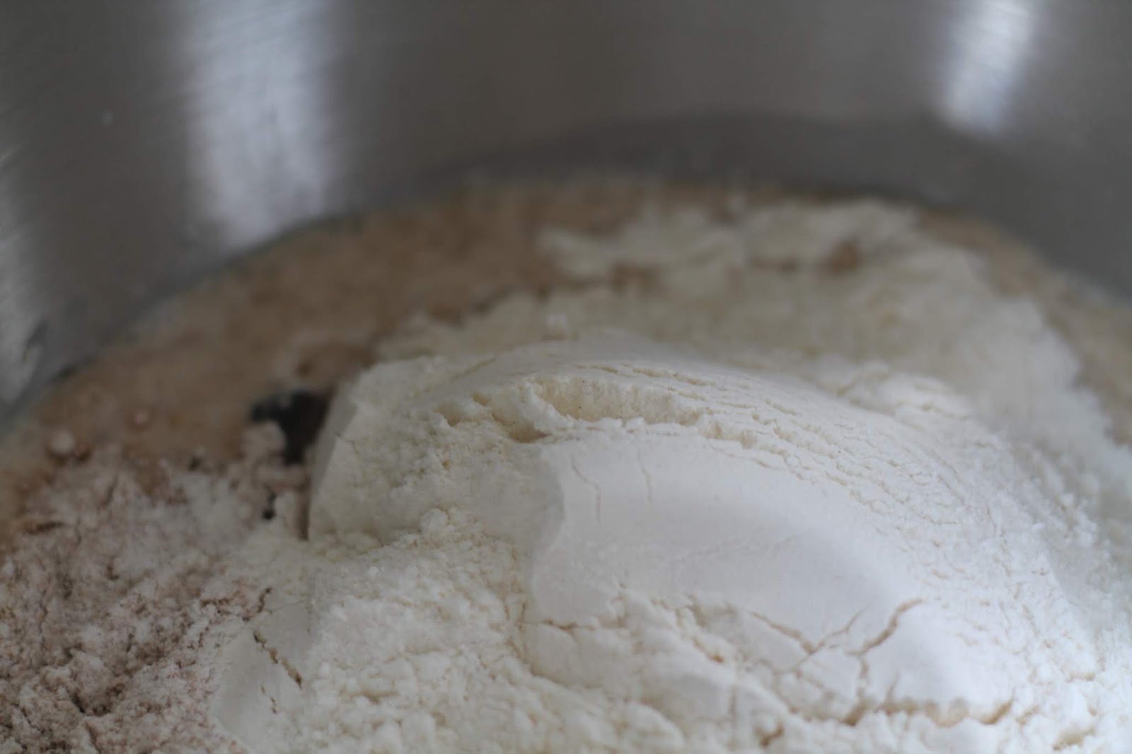 (I use 1 cup whole wheat, the rest all-purpose because it's what I always have on hand. Bread flour is fine, it'll make it rise a little higher but it's also more expensive and I can't buy it in bulk around here)