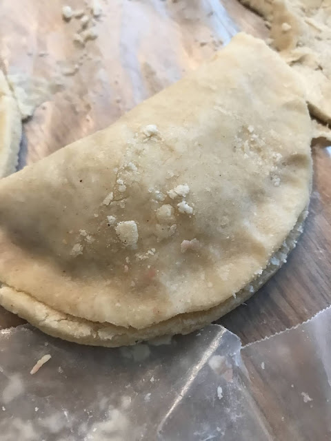 Using a rolling pin, thin each circle just slightly more (spreading them 1/2 inch more) with an additional roll of the rolling pin. The circles may take on a slightly oblong shape-with the extra roll which is fine. Re-roll any scraps to make additional dough circles.