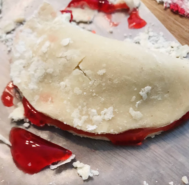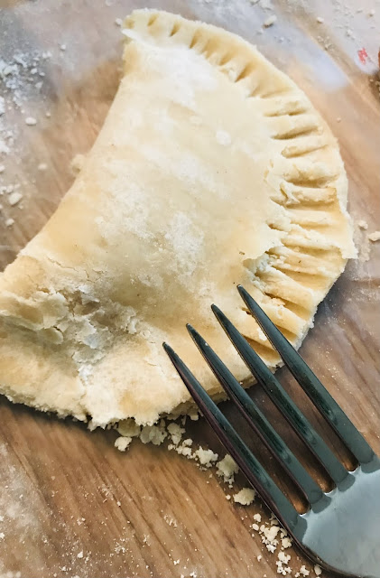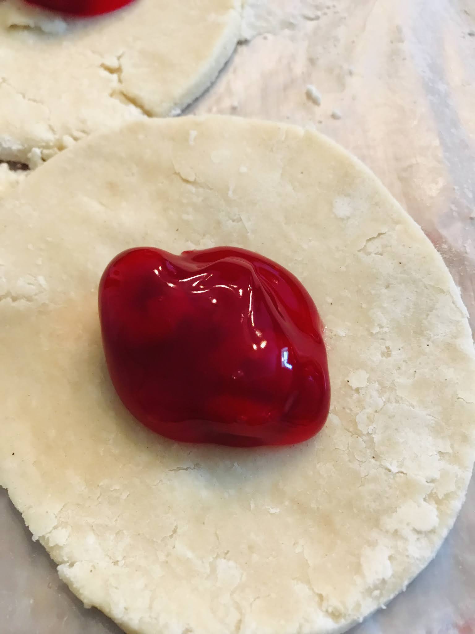 Step 4: In the middle of each dough circle, place 1 Tablespoon of the cherry pie filling. Fold the dough over-to cover the filling. Crimp edges of the dough together by pressing together with fingers. Using a fork, use the fork tines to finish and secure the edges by pressing dough edges, trim excess.