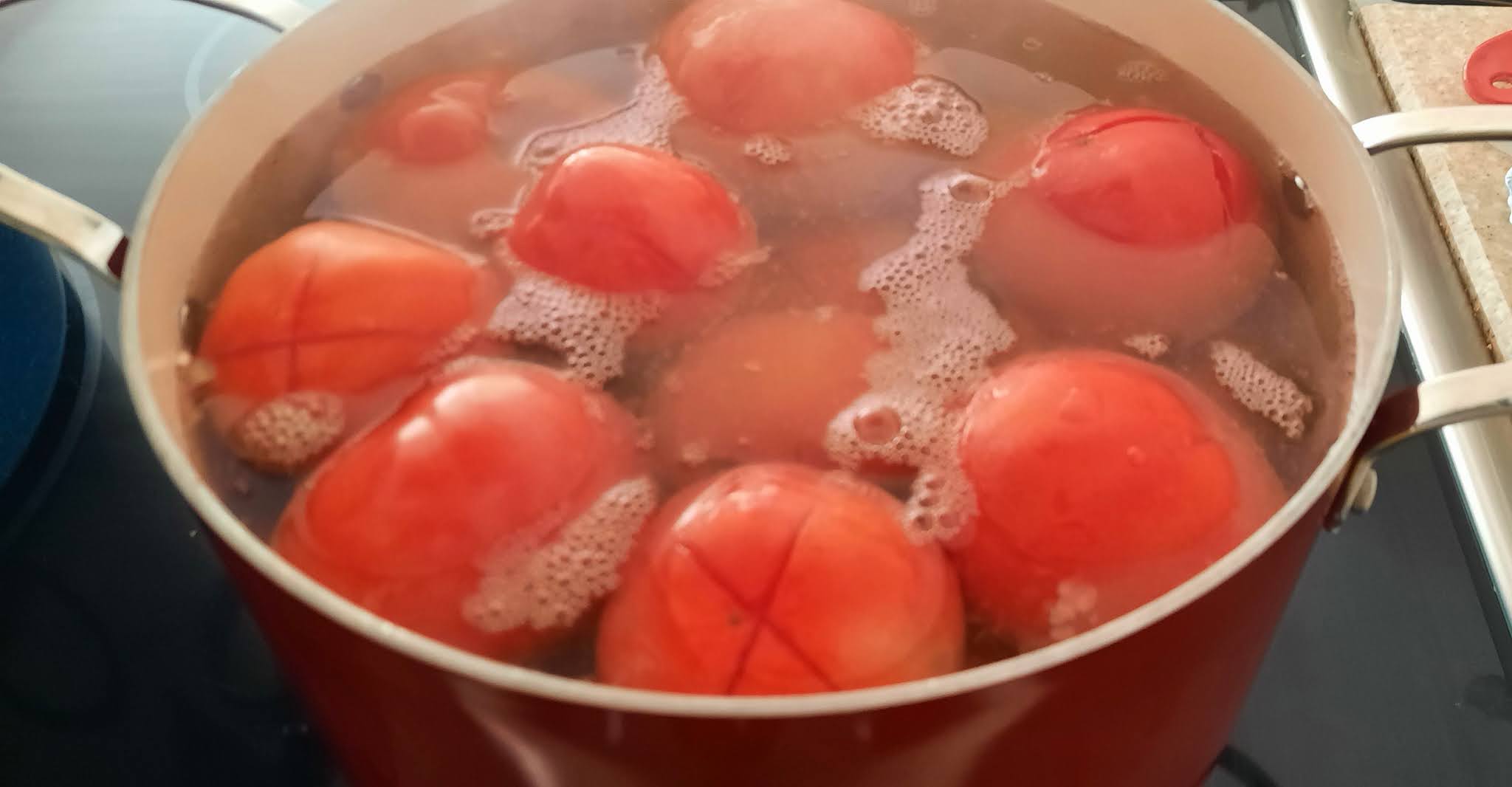 Then I simmer the large tomatoes in a pot of water, just enough to loosen up their skins. By having the X sliced on the bottom it makes it much easier to peel the loose skin off the tomato.