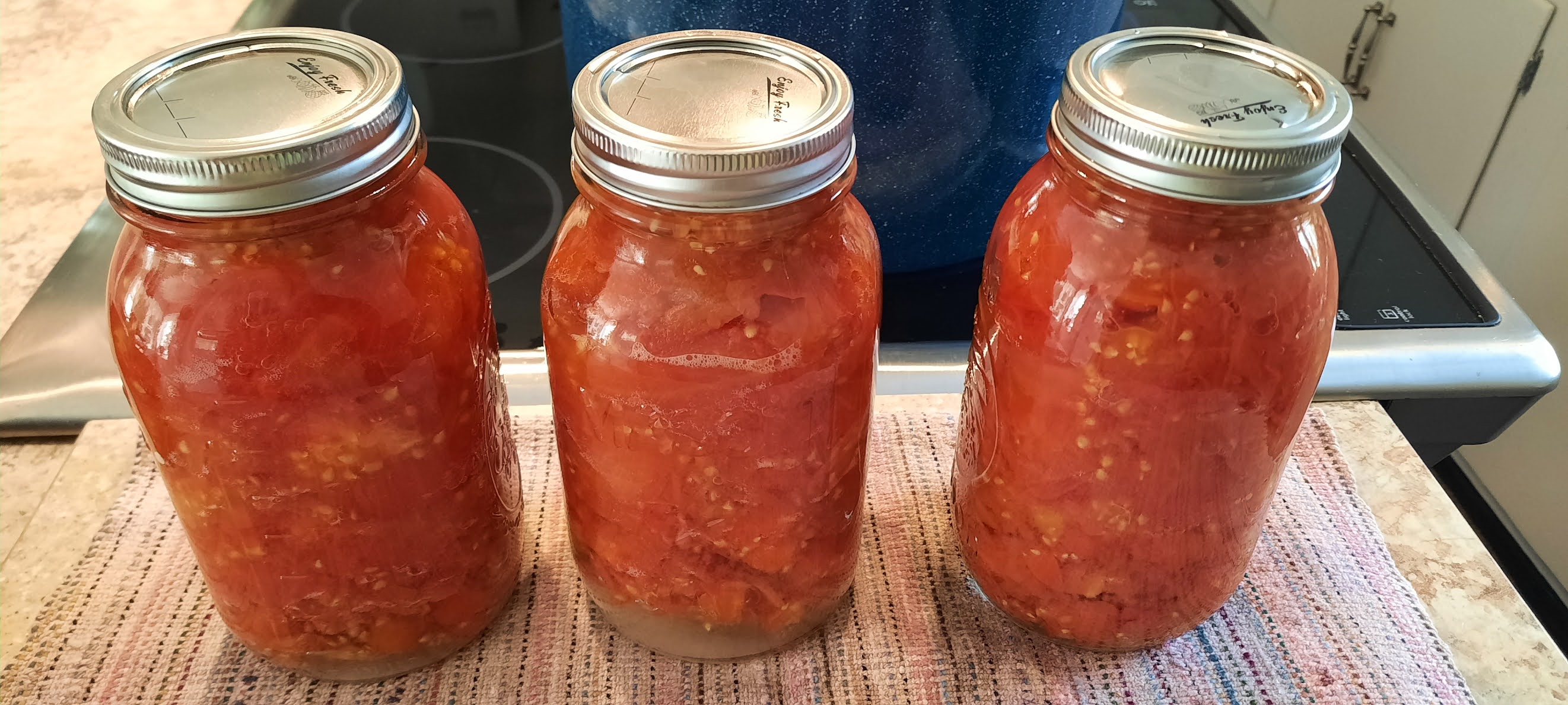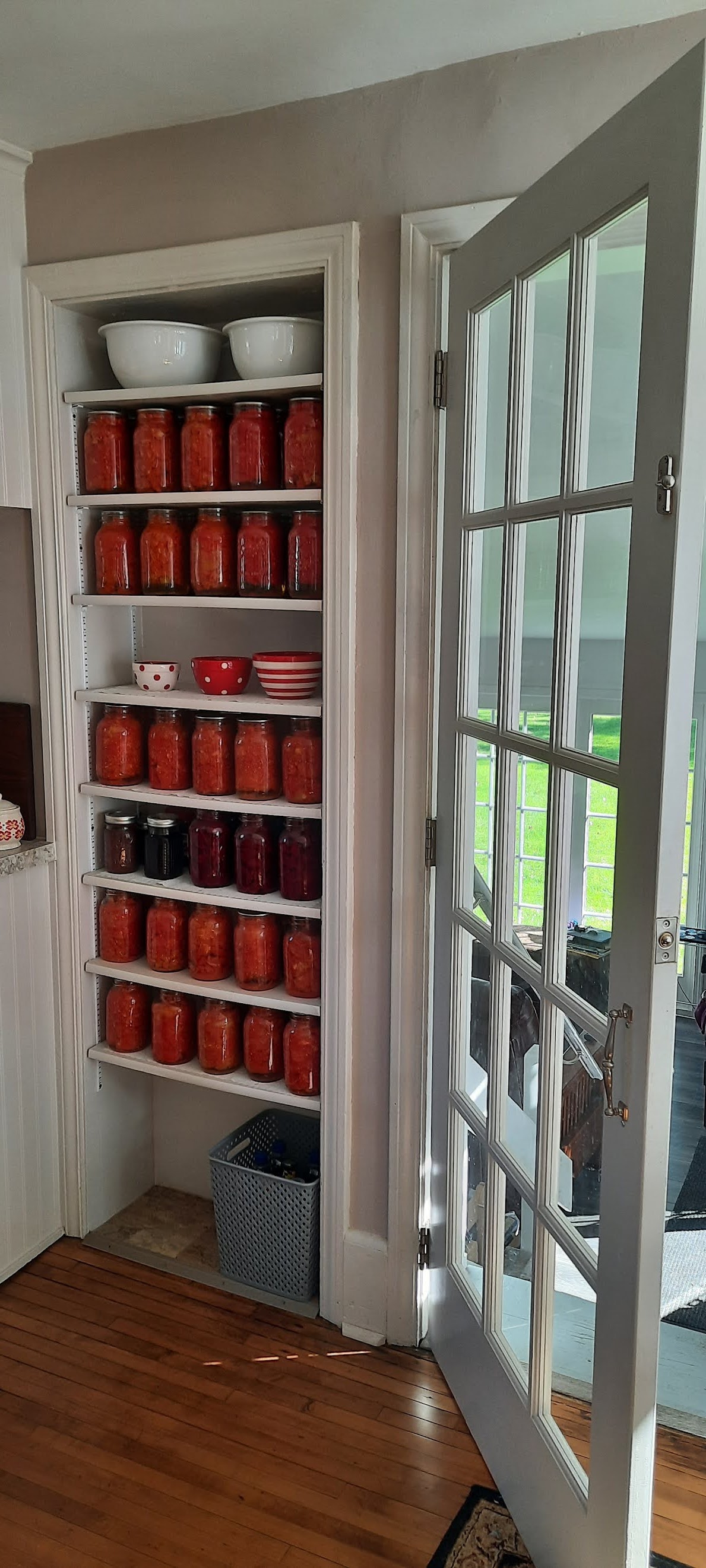 I line them up on my little pantry shelves. Row by row, jar by jar, my shelves are filling up for the long winter. Nothing can be better than popping open a jar in the middle of winter to make a pot of chili or a casserole. The smell of summer comes wafting up. I reach in with a fork and take out the first chunk of tomato and eat it straight from the jar. That is my reward for these hot days of summer, processing these tomatoes.