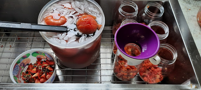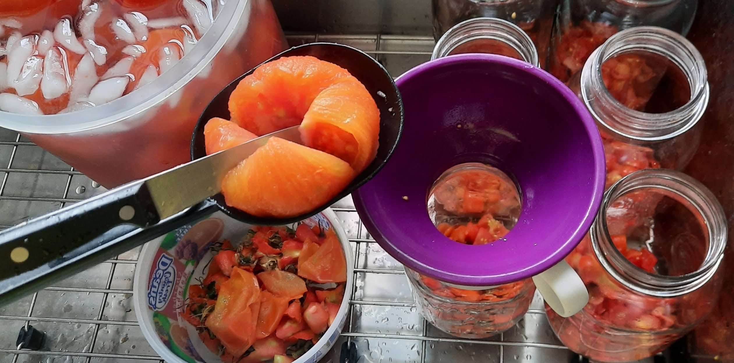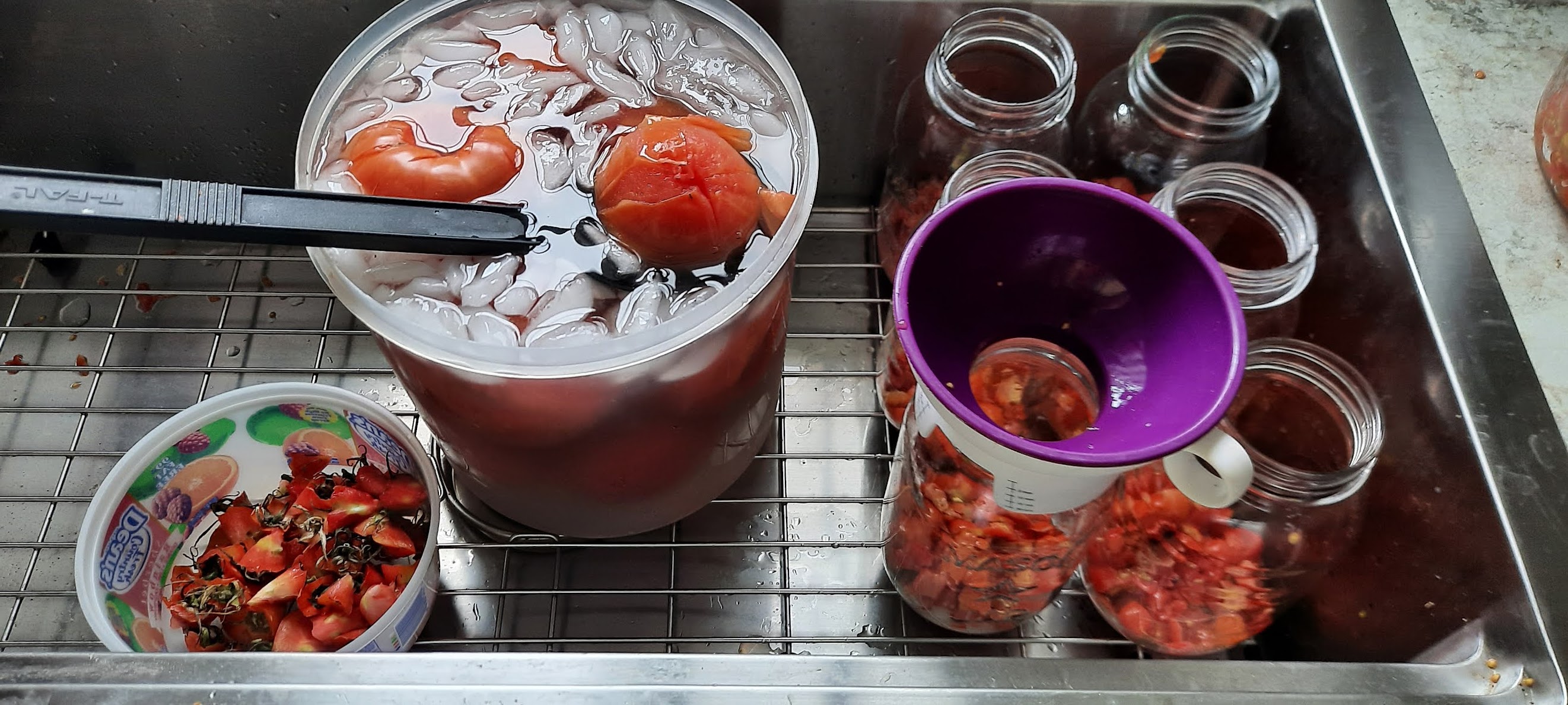I plunged the simmered tomatoes into a big tub of ice water. That helps loosen the skins up even more. I ladle them out with a large slotted spoon & peel the skins away to discard. In the bottom of the jars I have a tablespoon of lemon juice, a tablespoon of pickling salt, and a couple scoops of the chopped up little grape tomatoes.