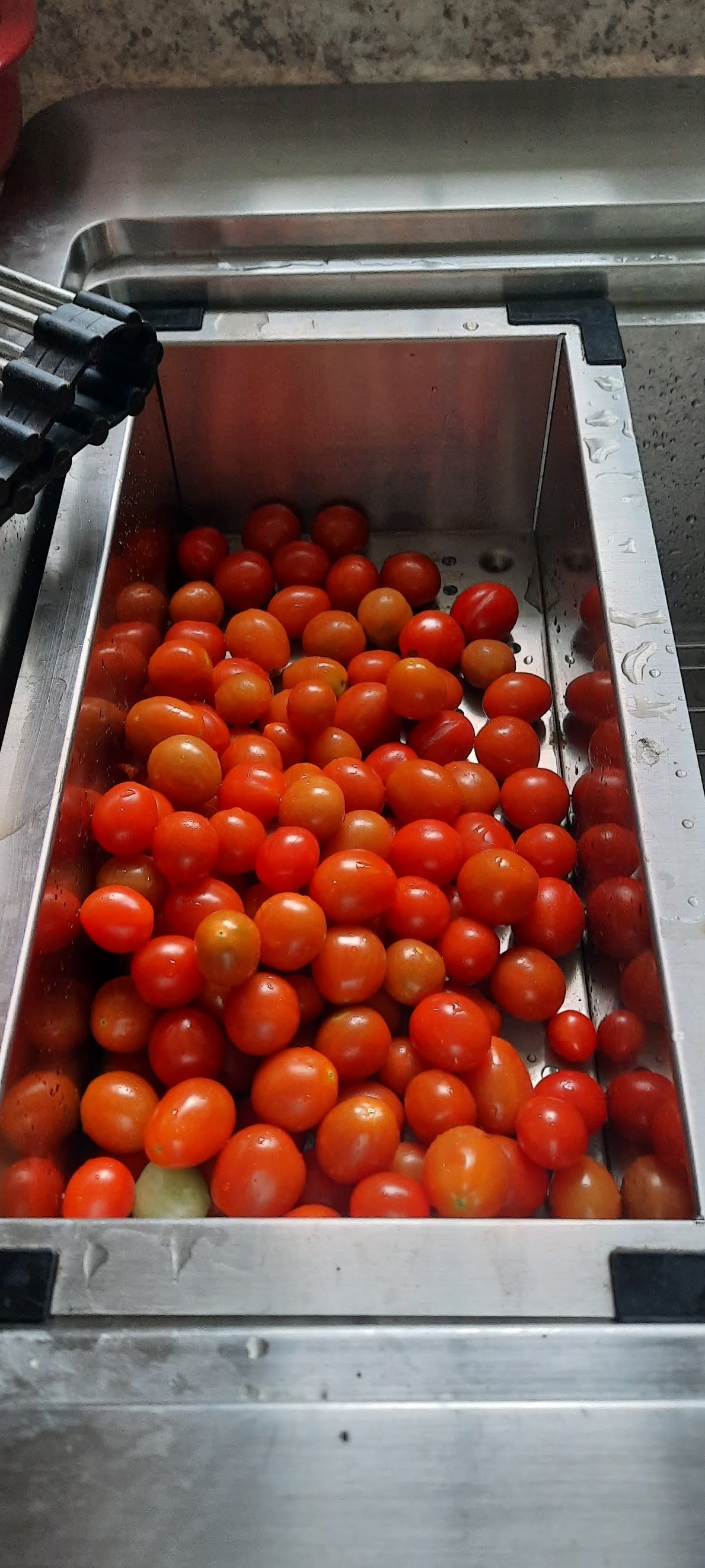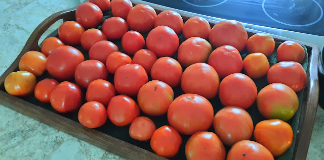 Silly me, remember when I was so excited my very first grape tomatoes this year? It was such a delight to go out and pick one at a time as soon as it turned red and pop it into my mouth. They started out slowly, one by one. The grandkids would go out and look all around for even ONE little tomato, to nab it from the vine and bring it in like a treasure.