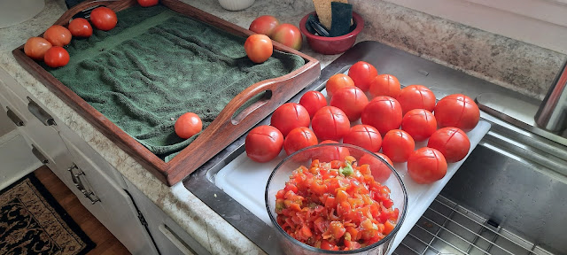 I chopped all of the little ones in my food chopper with the skins on. Then with the large tomatoes I cut out the stems and I slice an X into the bottom of each tomato. Roger, if you are reading this blog, that is your beautiful tray right there... I used it to carry the tomatoes over from the island to the counter. I love that tray!