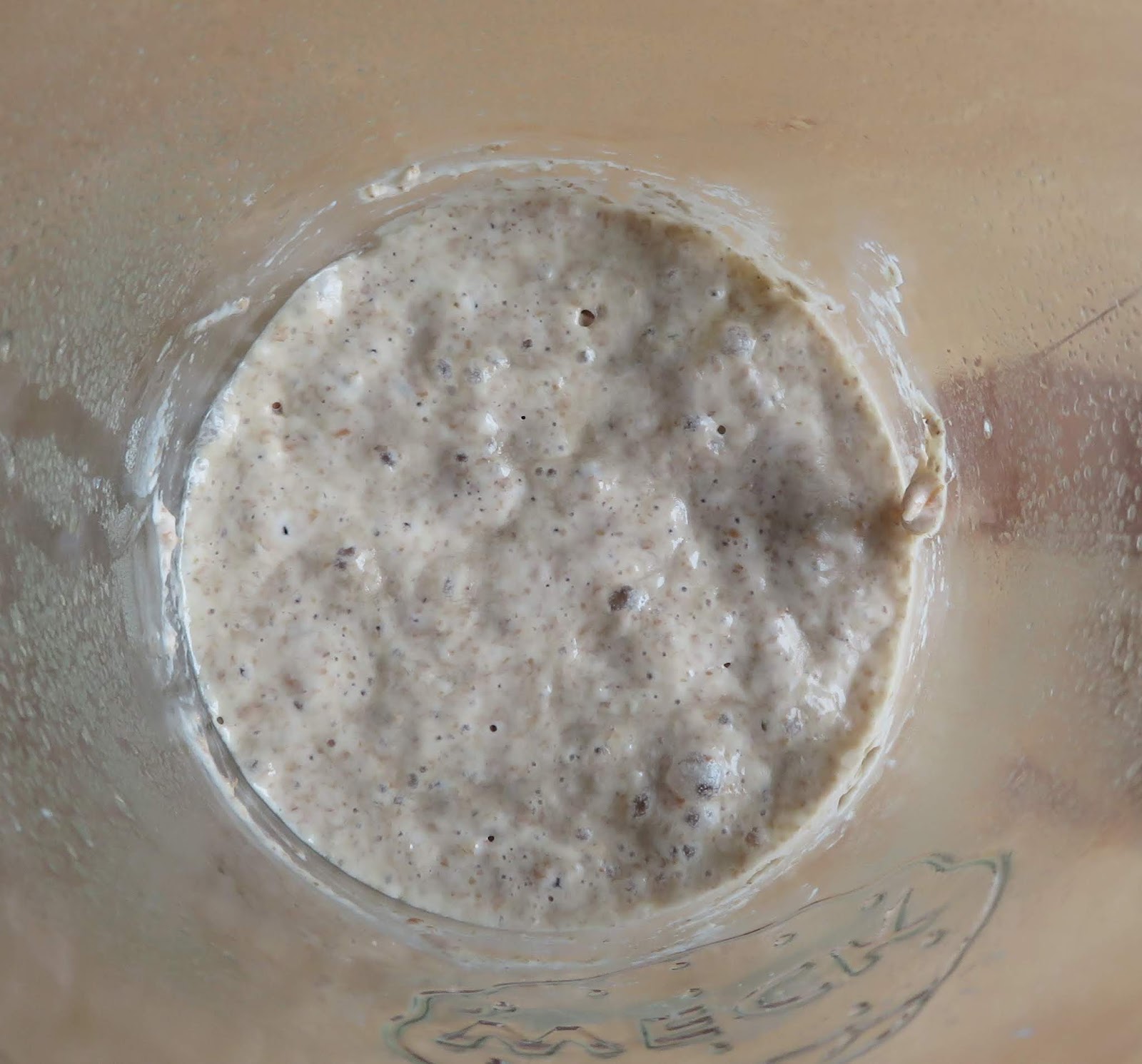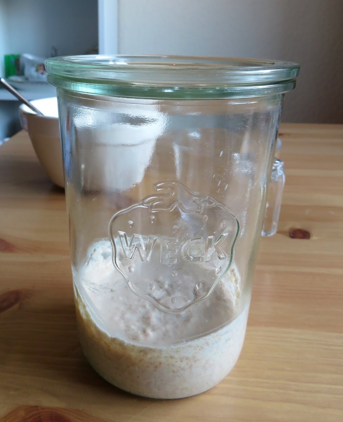 You will need a clean jar. What you are going to do now is to decant 3 TBS of the live mixture into a clean jar. Once you have done that you will need a further 70g (1/2 cup) of the whole wheat/white bread flour mix and a additional 80ml (1/3 cup) of filtered water.