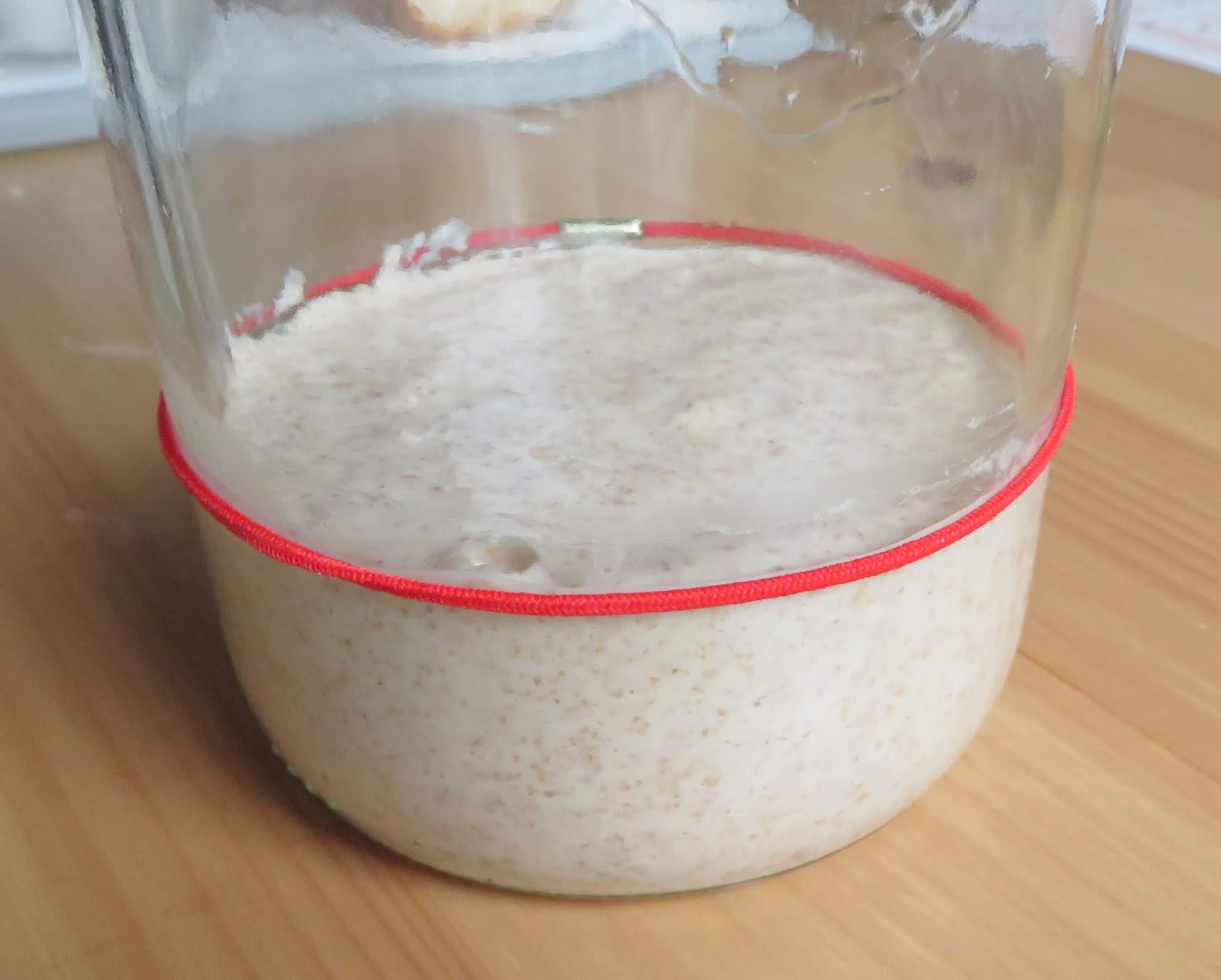 Put the lid back on the jar and then mark the level with a rubber band on the outside of the jar. (Look, you can see it already bubbling.) Set it aside to work for 11 hours now.
