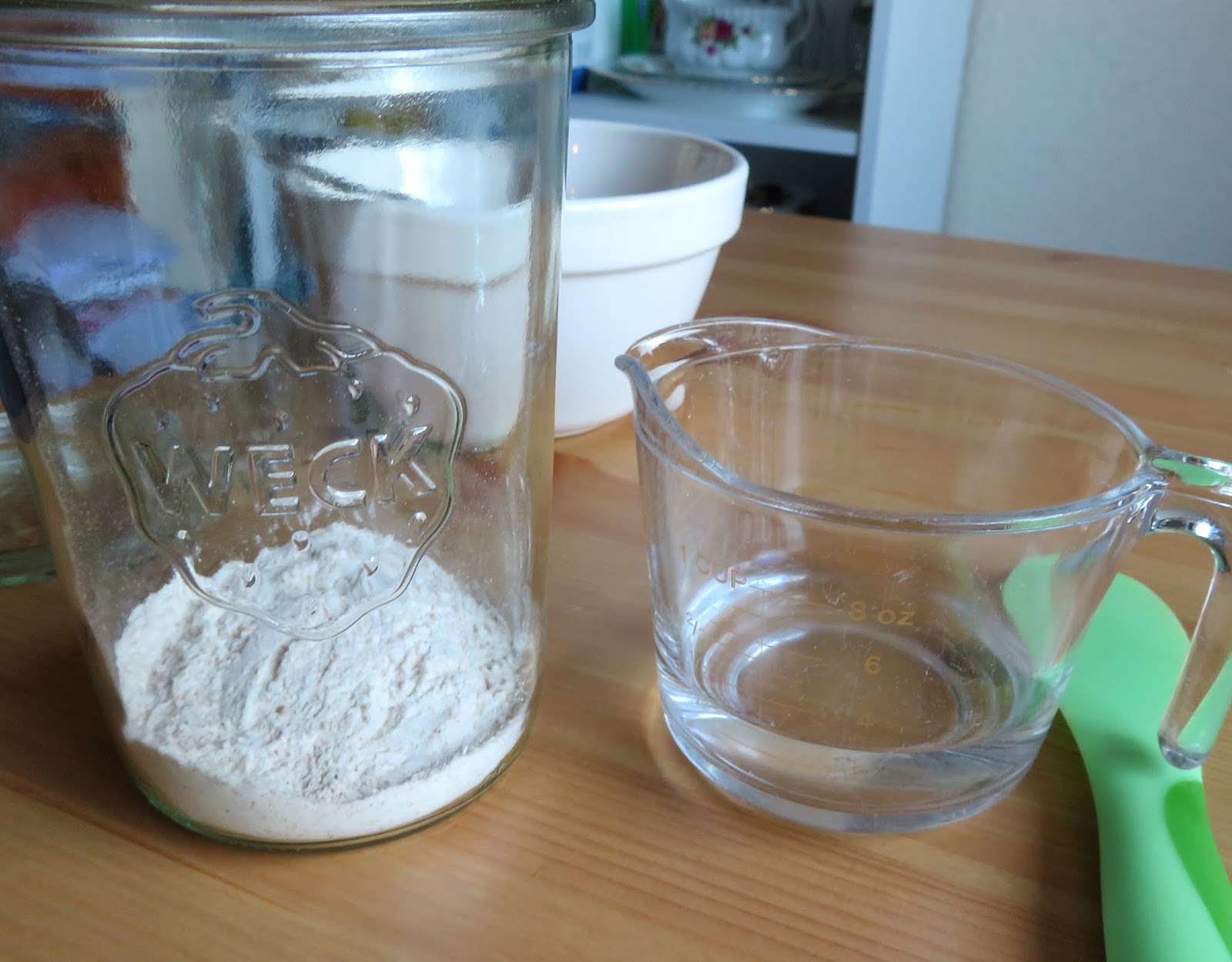 Measure 50g (6 1/2 TBS) of your flour mixture into the glass jar. Add 100g ( 3.5 fluid ounces) of the filtered water.