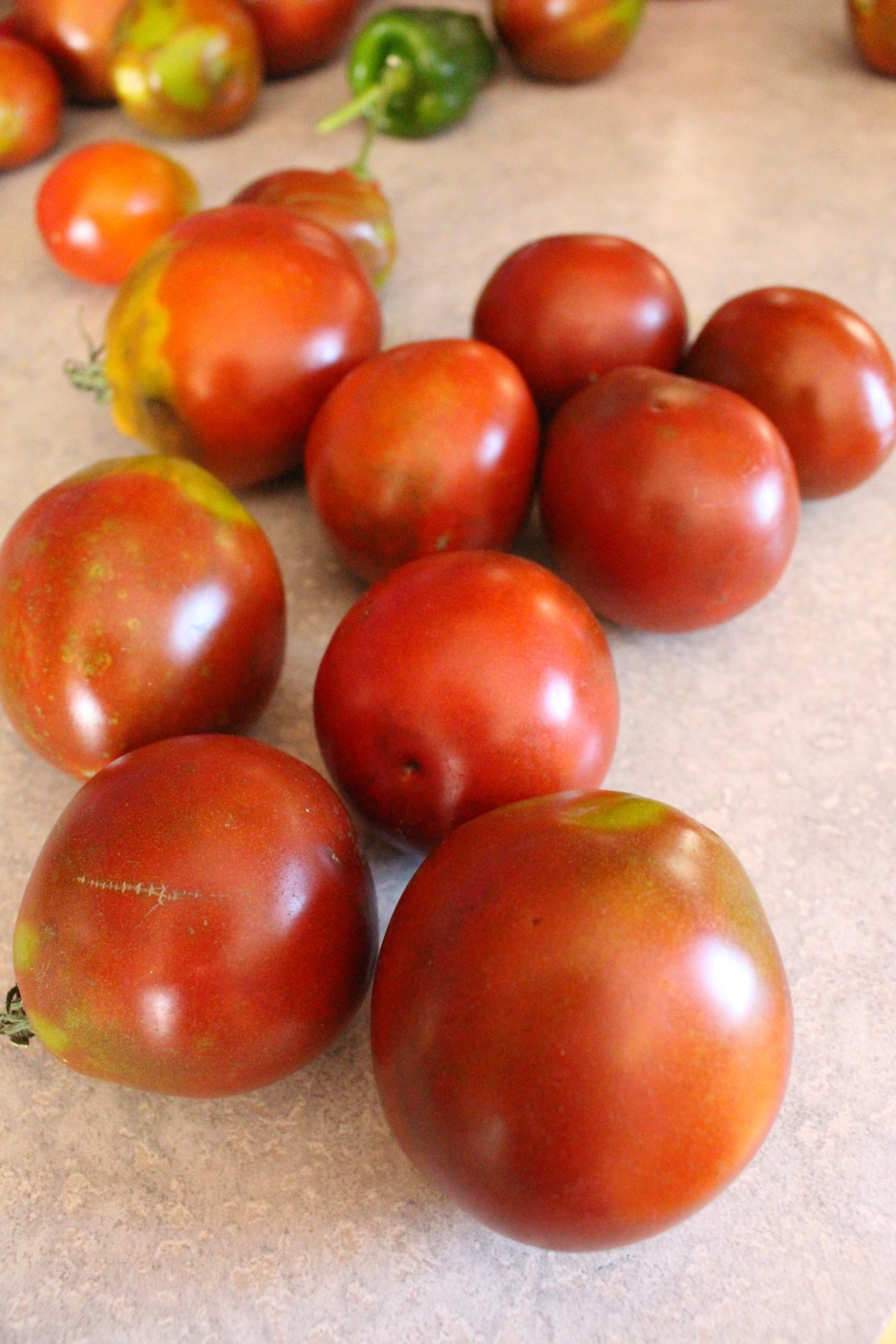 Since we grew Japanese Black Trifele heirloom tomatoes this summer, {which are similar in taste to Black Krim tomatoes} that’s what I used, but I know plum tomatoes work well with this recipe as well.